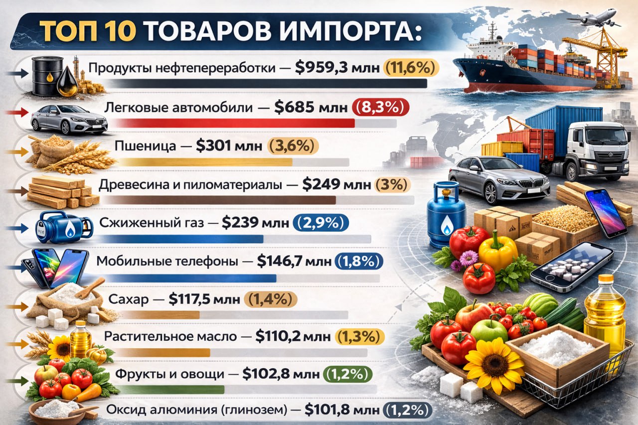 В прошедшем году импорт товаров составил около $8,3 млрд, что на $1,3 млрд или 18,6% больше по сравнению с 2024 годом.