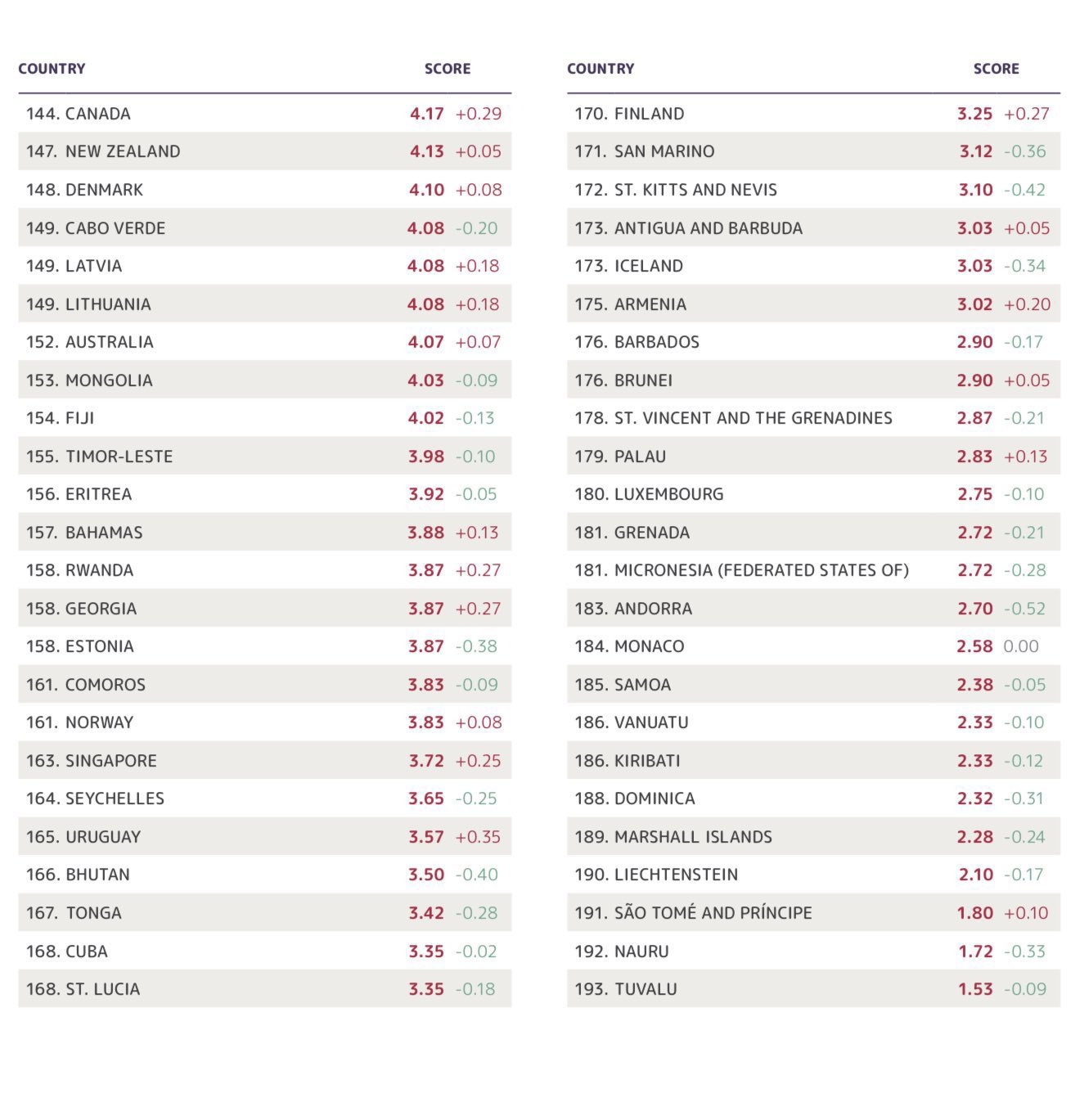 Монголия заняла 153-е место после Дании (148-е место), Латвии (149-е место), Литвы (149-е место) и Австралии (152-е место).