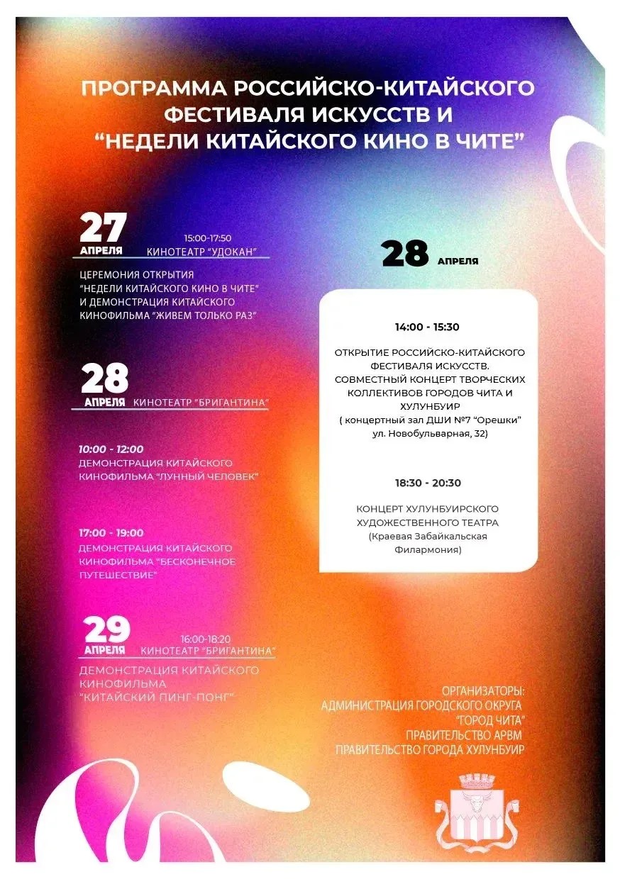 В Чите в третий раз пройдет Неделя китайского кино. В нынешнем году она будет усилена Российско-китайским Фестивалем искусств, в рамках которого в Читу приедет профессиональный художественный театр города Хулунбуир. Об этом сообщили в пресс-службе мэрии краевой столицы.